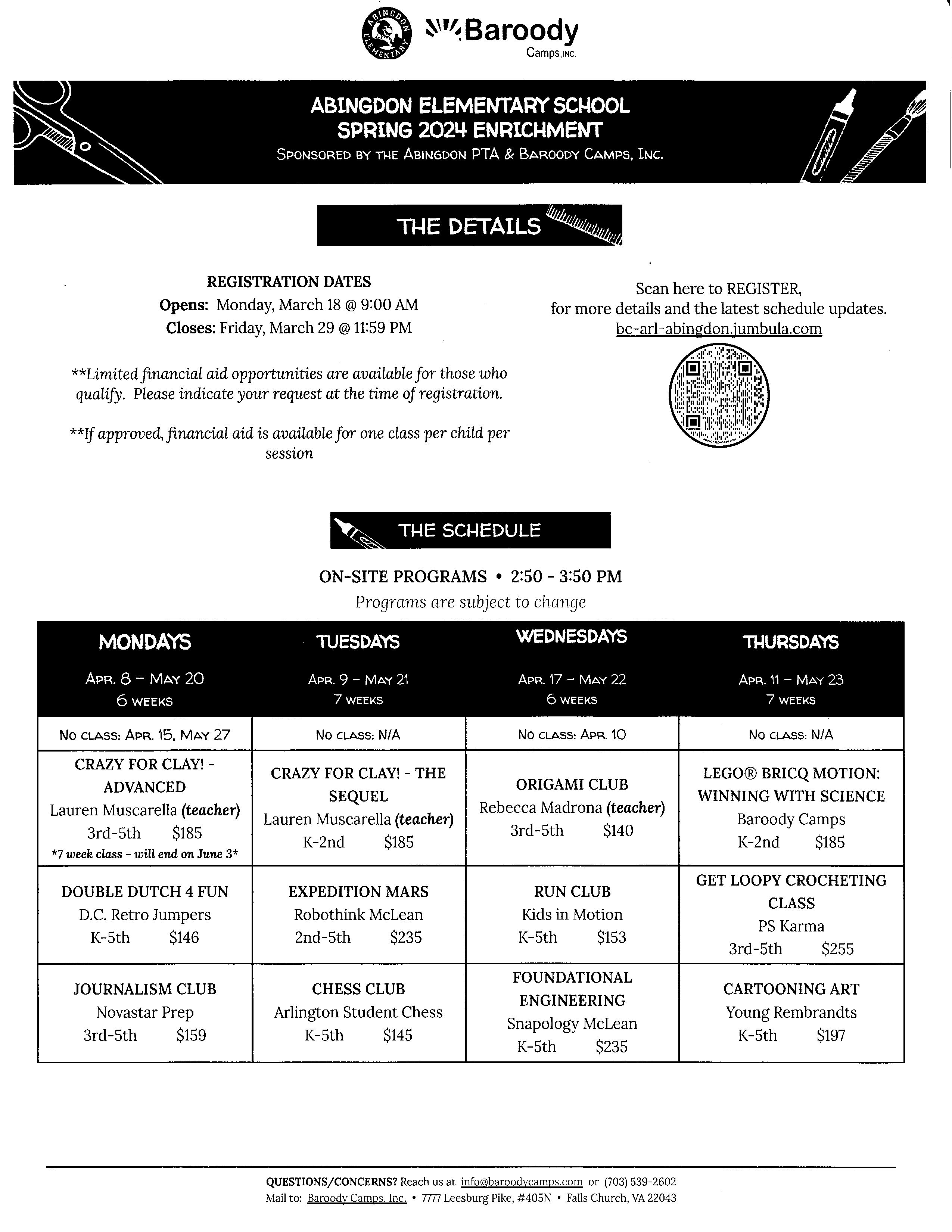 It’s time to register for the Spring Session of after-school enrichment classes! The Abingdon PTA is partnering with Baroody Camps to offer this program.